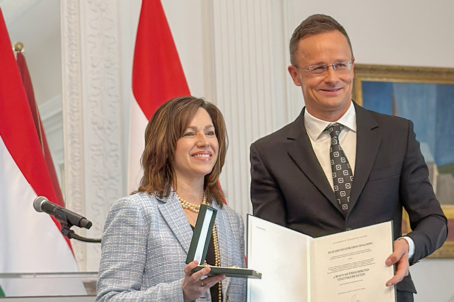 WASHINGTON, D.C. — On Wednesday, October 22nd, Dr. Elizabeth Spalding (’88), Chairman of the Victims of Communism Memorial Foundation and Visiting Fellow at Hillsdale College’s Van Andel Graduate School of Government, was awarded the Officer’s Cross of the Order of Merit of Hungary. The award, bestowed by the President of Hungary Tamás Sulyok, was read by Hungarian Ambassador to the United States Szabolcs Takács and presented by the Hungarian Foreign Minister Peter Szijjarto at the Hungarian Embassy in Washington, D.C. at the embassy’s commemoration of the anniversary of the 1956 Hungarian Revolution. Also in attendance was Christopher Landau, the Deputy Secretary of State of the United States.